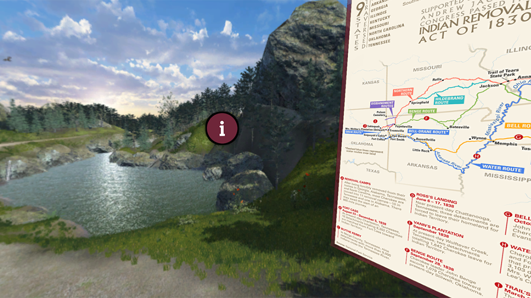 The Trail of Tears Park, located on the UA Little Rock campus, details the forced migration of the Native American population from their ancestral lands in the name of western expansion. This tour, designed by the Emerging Analytics Center, allows users to virtually explore the park and read all of the information it has to offer. Users will begin the tour next to Asher Avenue – a street that was once part of the path taken by Native Americans. The 360 Trail of Tears tour is currently built for both the WebGL and Oculus VR platforms.